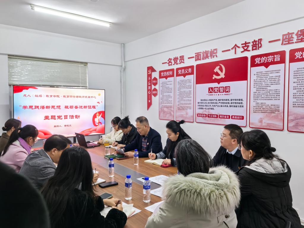 为深入学习贯彻习近平新时代中国特色社会主义思想,筑牢党员思想根基,凝聚两部门协同发展合力,近日,成人教育学院党支部与教育评价与发展中心党支部联合开展“学思践悟新思想 砥砺奋进新征程”主题党日活动。两部门全体党员齐聚一堂,通过集中学习、专题研讨、总结提升等环节,在学思践悟中汲取奋进力量,为学校高质量发展和申博工作注入强劲动力。